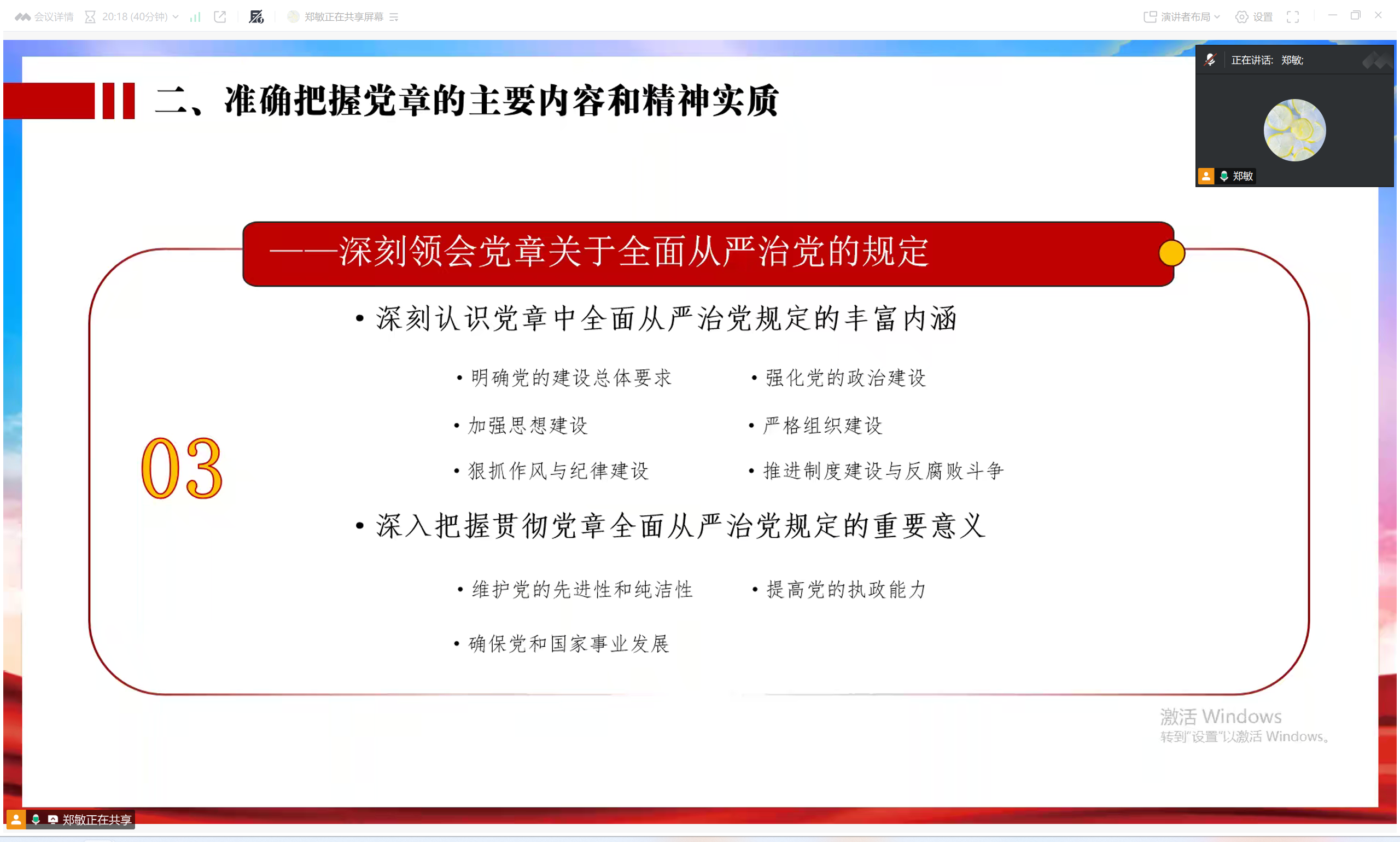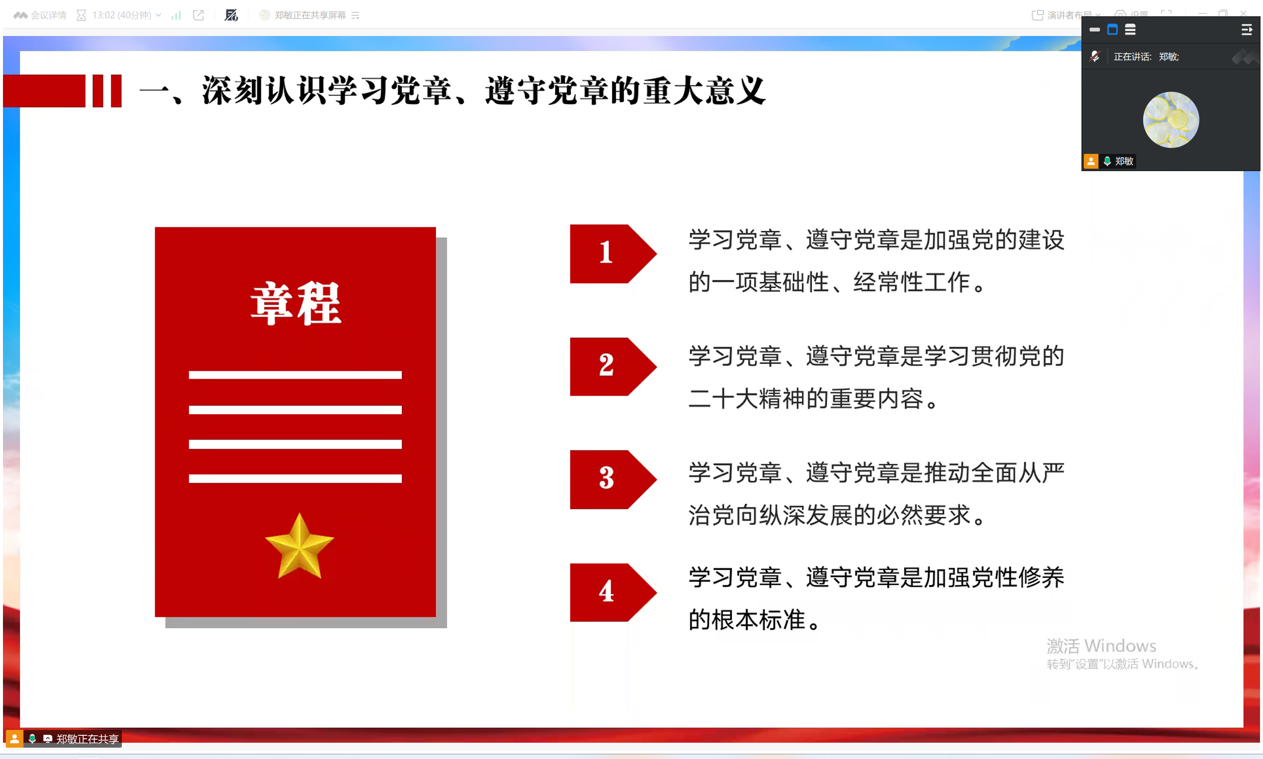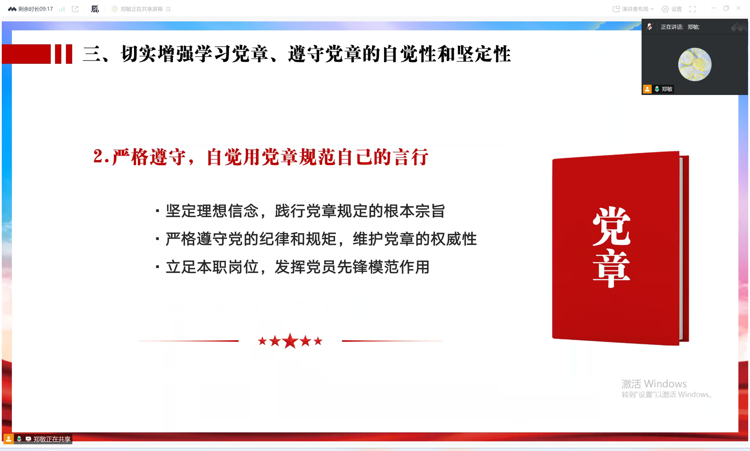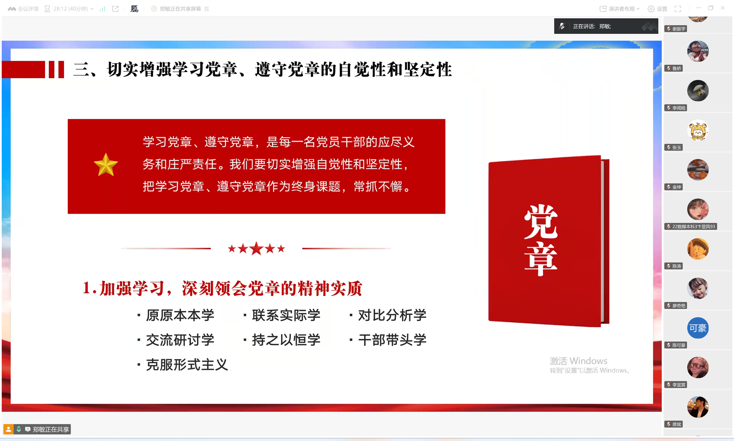 在专题领学环节,郑敏同志围绕“深刻认识学习党章、遵守党章的重大意义”、“准确把握党章内容与精神实质”、“切实增强学习党章、遵守党章的自觉性与坚定性”三个方面进行阐述。