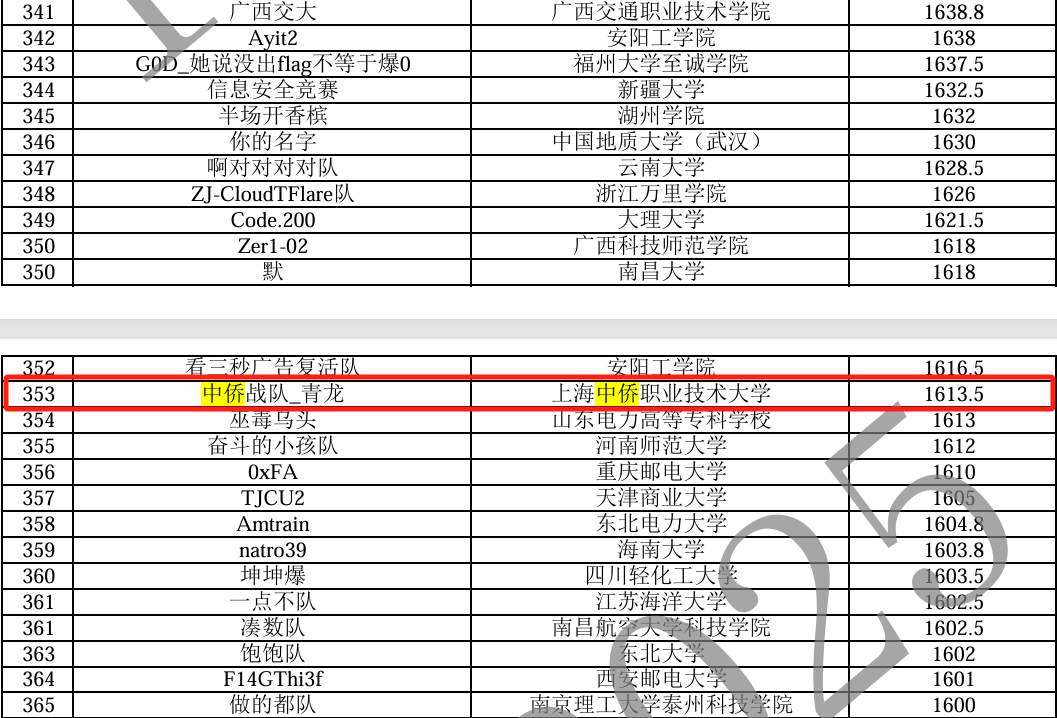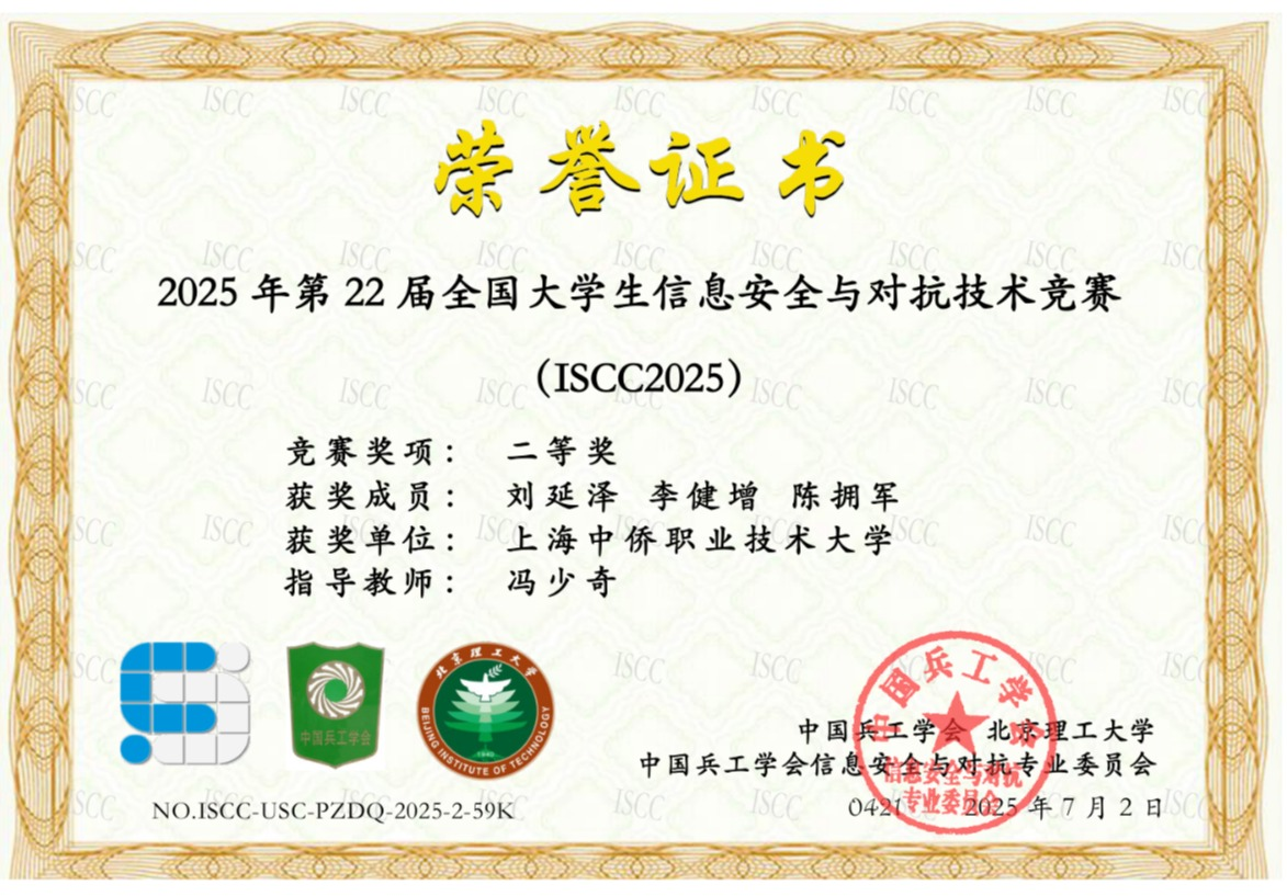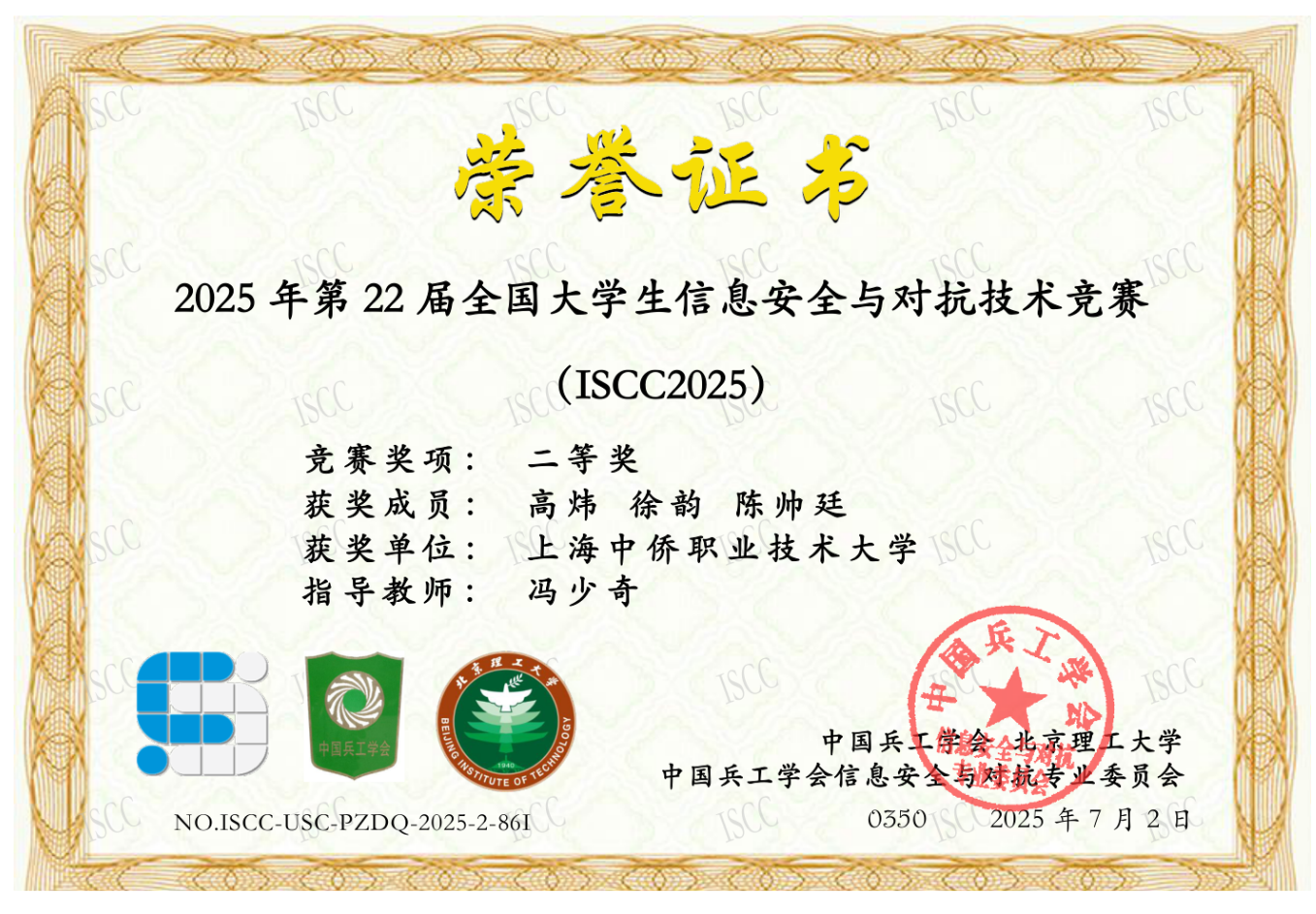 2025年7月14日,2025年第22届全国大学生信息安全与对抗技术竞赛(ISCC 2025)正式颁奖,上海中侨职业技术大学信息工程学院物联网技术本科专业学生在破阵夺旗赛中斩获二等奖2项。在1511支晋级队伍中,由高炜、徐韵、陈帅廷三名同学组成的“中侨战队_青龙”全国排名353名,由刘延泽、李健增、陈拥军三名同学组成的“上海中侨_玄武”全国排名424名。本次竞赛由信息工程学院物联网工程技术专业冯少奇老师指导完成。