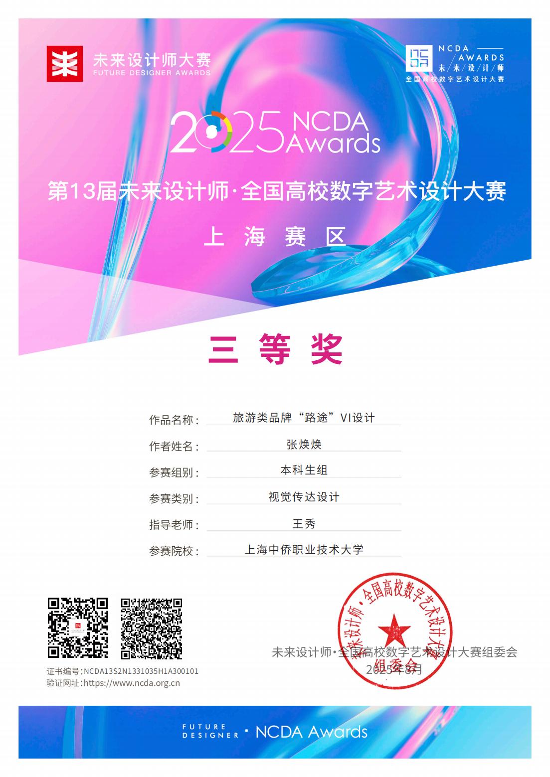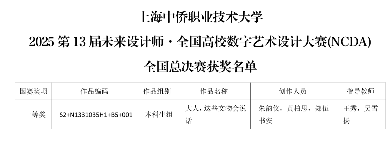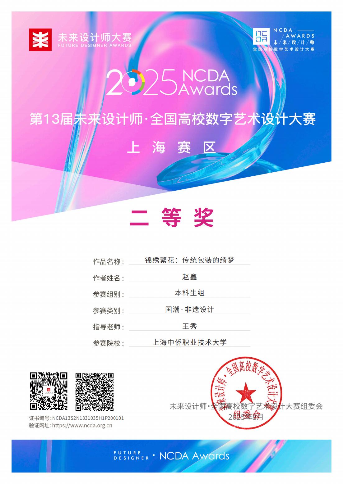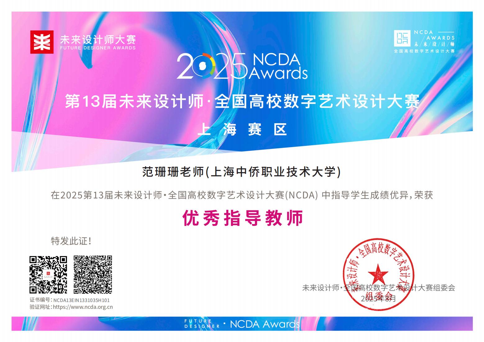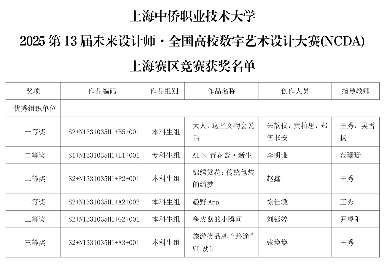 近日,2025 年第 13 届未来设计师・全国高校数字艺术设计大赛(NCDA)市赛与国赛结果先后揭晓。信息工程学院学子凭借扎实的专业功底、创新的设计思维,在全国 1893 所高校、29 万余件参赛作品的激烈角逐中脱颖而出,斩获全国总决赛一等奖 1 项、上海赛区一等奖1项,二等奖3项与三等奖 2 项。同时王秀,吴雪扬、范珊珊三位老师获优秀指导教师称号。
