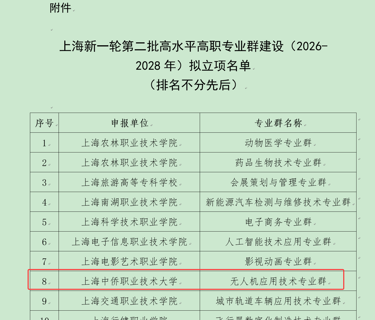 近日,上海市教育委员会职业教育处公示新一轮第二批高水平高职专业群建设(2026-2028年)拟立项名单,我校“无人机应用技术专业群”成功入选,标志着我校在低空经济领域人才培养再获官方认可。