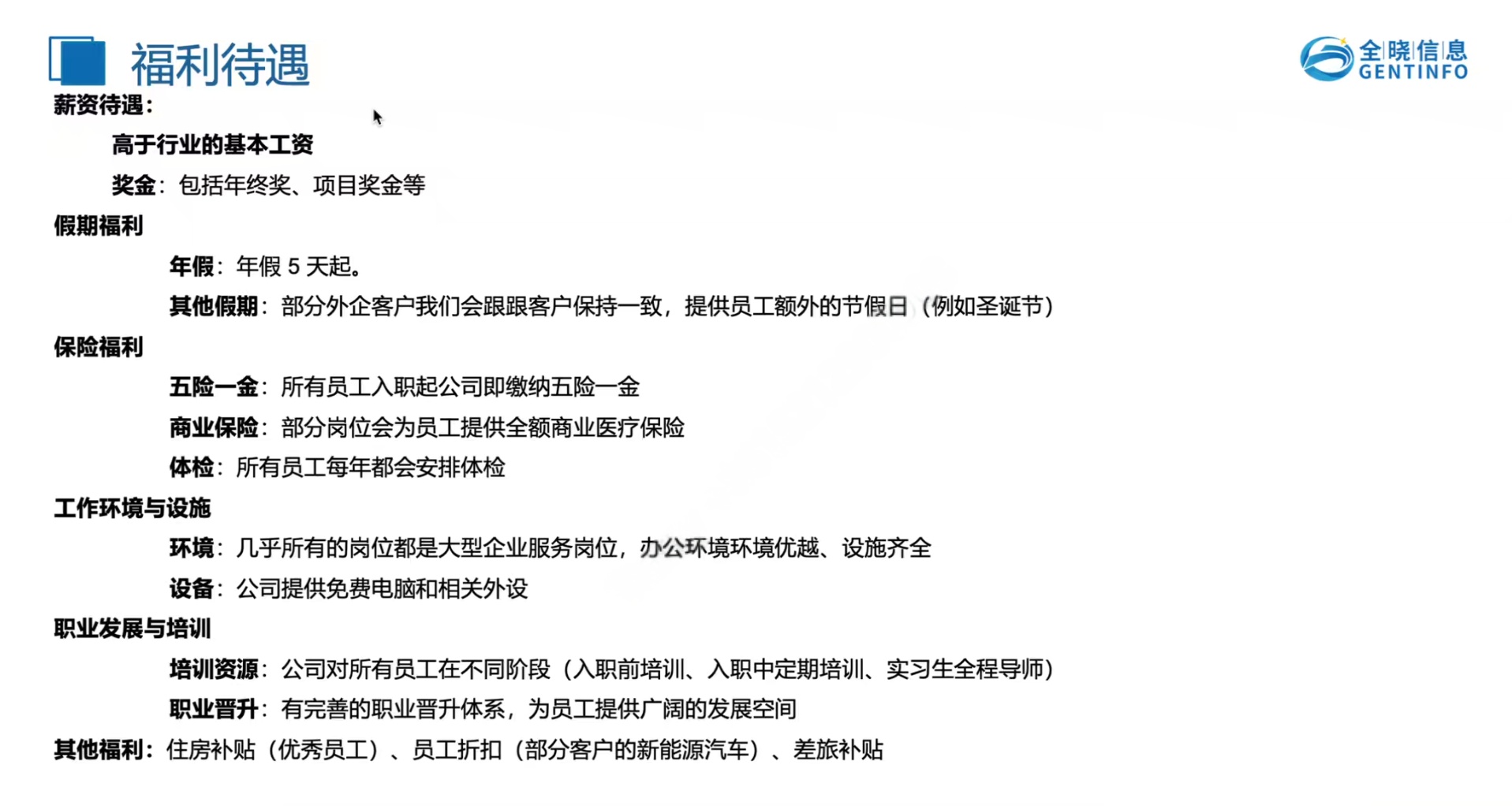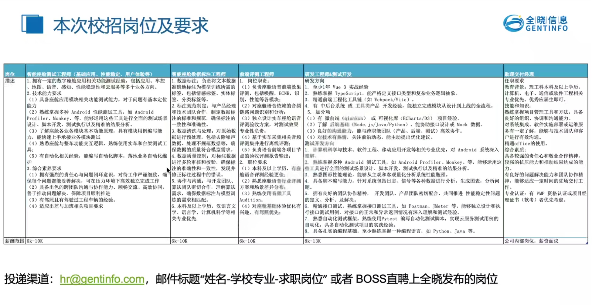 全晓信息本次宣讲会带来的岗位有:智能座舱测试工程师、大数据标注工程师、前端评测工程师、研发工程师、测试开发工程师、交付经理助理,薪酬6K—13K,入职即享五险一金、商业医疗险、双奖金、住房与差旅补贴、新能源汽车内购折扣。企业承诺“导师+项目”双轨培养,三年两次晋升通道。