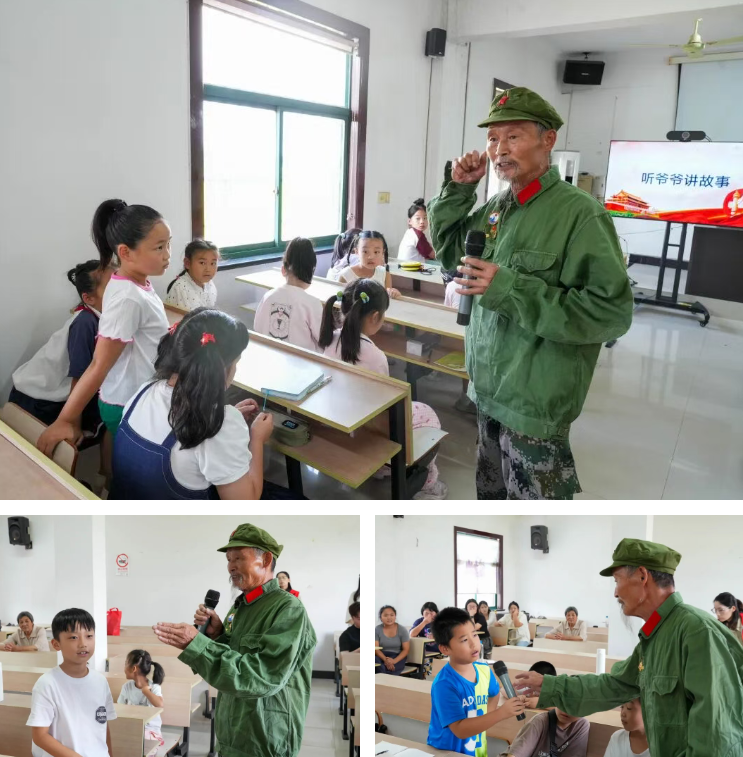 进入“听爷爷讲故事”环节,孙爷爷缓缓讲述起那段热血峥嵘的岁月。孩子们瞬间投入专注状态:一个个挺直小身板,睁着好奇又认真的大眼睛,生怕错过任何一个细节;有的悄悄握紧小拳头,有的轻轻蹙起眉头,完全沉浸在爷爷的讲述里,那模样仿佛跟着爷爷穿越时空,回到了硝烟与青春交织的战场年代。