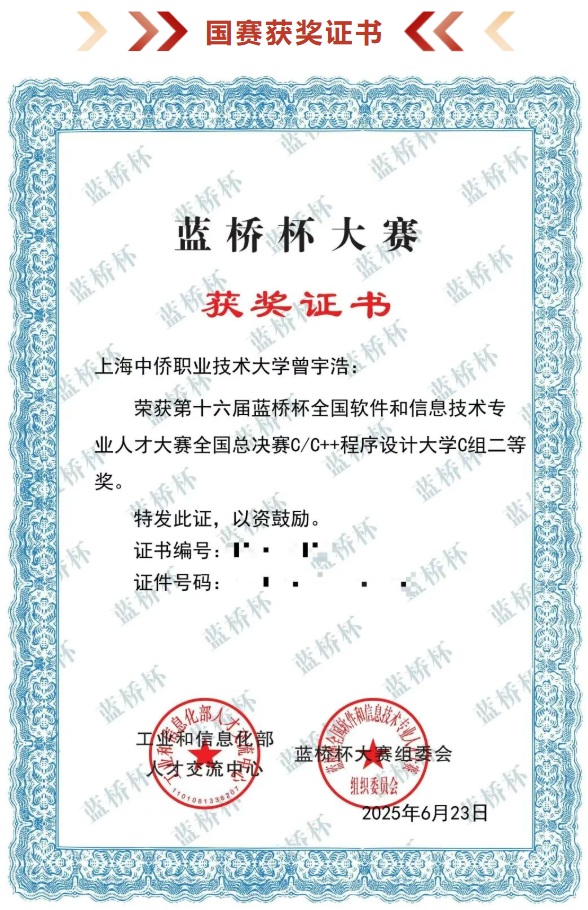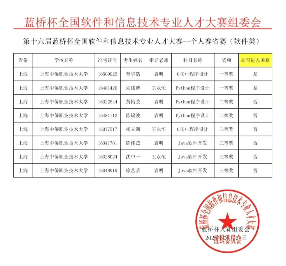 历经四个小时的竞赛,与来自全国各个高校的学生进行激烈角逐,选手们获得了优异的成绩:其中袁明老师指导的曾宇浩同学在C/C++程序设计赛项中获得一等奖,黄怡荥同学和陈锦波同学在python程序设计赛项中获得二等奖,陈佳蕊同学和徐艺芸同学在Java软件开发赛项中获得三等奖;王永恒老师指导的学生朱炜博同学在python程序设计赛项中获得一等奖,杨立洲同学在C/C++程序设计赛项中获得三等奖,沈中一同学在Java软件开发赛项中获得三等奖。在2025年6月15日举办的全国总决赛C/C++程序设计赛项总决赛中,曾宇浩同学荣获二等奖的优异成绩。