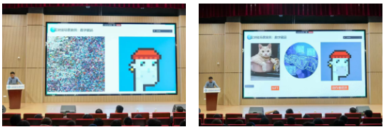 为简化理解,讲座设“数字藏品互动展示”,杨老师团队展示系列数字藏品,讲解NFT技术为创作者赋予作品唯一标识与流转价值,现场互动热烈。技术原理环节,他以“班级班费管理”举例,对比中心化与分布式账本差异,直观阐释去中心化优势;通过节点交互演示,呈现“链式存储、哈希加密、共识机制”等技术细节,让抽象原理可感可知。