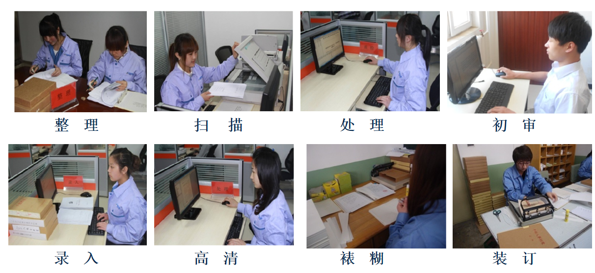 1.档案整理,2.档案信息录入,3.档案纸质扫描,4.图像处理对档案图像按照要求进行处理与优化,使页面整洁清晰,资料整理,按照要求分类,将原始材料先排序,再打页码,整理成册,形成档案